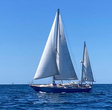 A Camper & Nicholson is a keel rudder boat, and they are very different to handle than a full keel boat. A full keel boat has that long backbone under her, and she will track in a way you can feel. A keel rudder boat is more responsive, but in tight water, shallow water, and heavy wind, she will make you work for every foot.